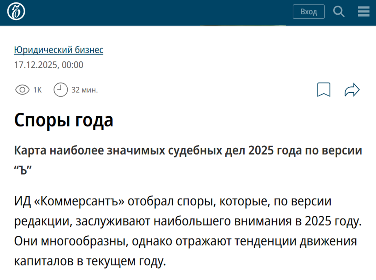 2 проекта КА «Ковалев, Тугуши и партнеры» отмечены в “Споры года: карта наиболее значимых судебных дел 2025 года по версии “Ъ”