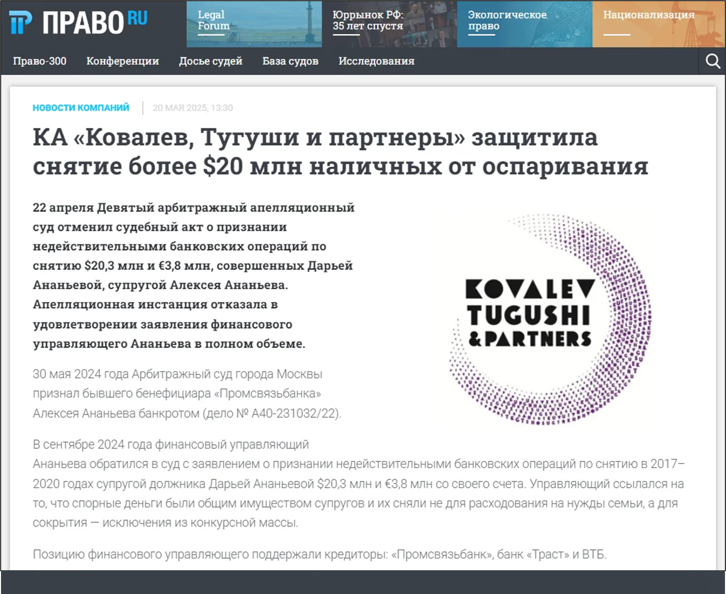 22 апреля Девятый арбитражный апелляционный суд отменил судебный акт о признании недействительными банковских операций по снятию $20,3 млн и €3,8 млн, совершенных Дарьей Ананьевой, супругой Алексея Ананьева. Апелляционная инстанция отказала в удовлетворении заявления финансового управляющего Ананьева в полном объеме.