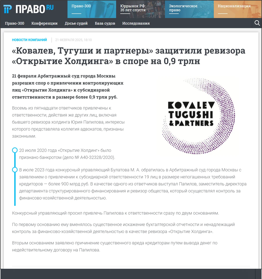 «Ковалев, Тугуши и партнеры» защитили ревизора «Открытие Холдинга» в споре на 0,9 трлн
