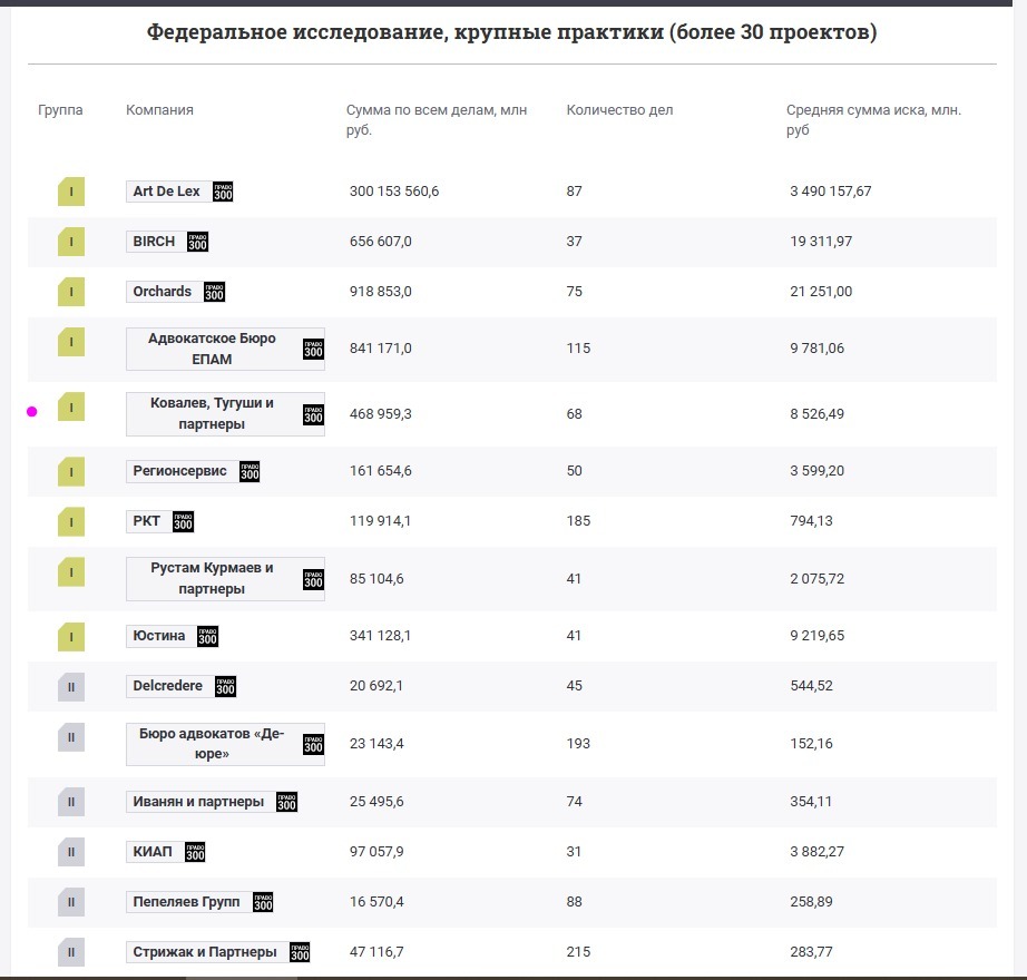 - I группа в Федеральном исследовании (компании с количеством дел 30 и больше) - шестой год подряд.
